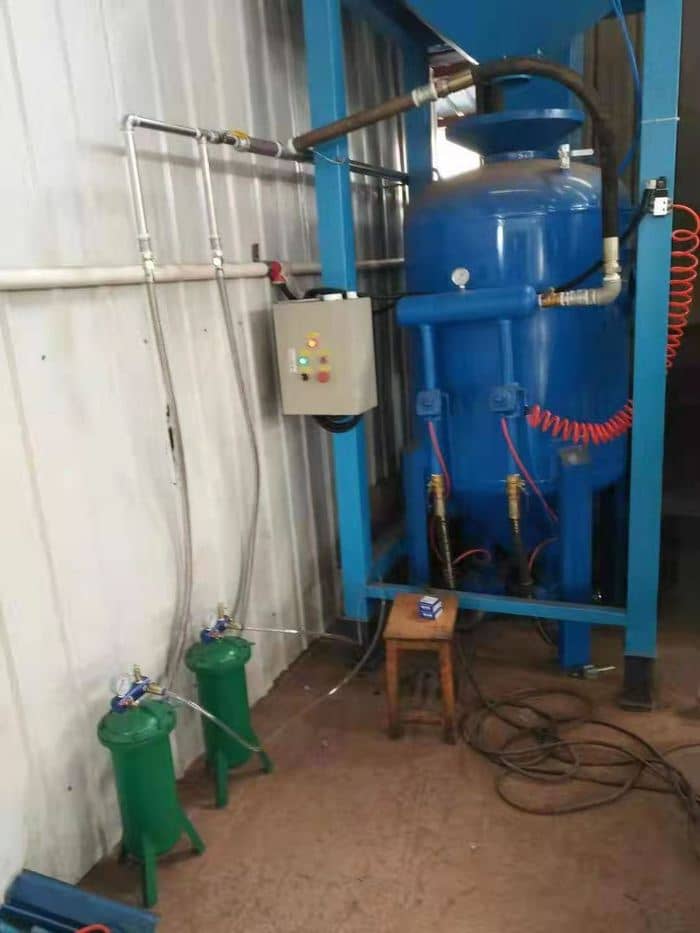 噴砂房自動上砂系統是根據客戶的投資預算和實際場地量身定制的性價比高的上砂裝置,人工將噴出去的砂收集到沙池,經提升機提升到噴砂罐上的儲砂箱里,噴砂罐的砂料用完后,只需按下電控箱的按鈕,儲砂箱即開始下砂,直到裝滿砂罐,工人再開始噴砂作業。