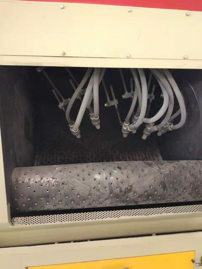 本機配置6支噴槍。生產過程中,工人將工件放置在機艙內的履帶滾筒內,關閉噴砂室艙門,然后開啟自動噴砂按鈕;工件由于輥軸帶動履帶滾筒旋轉而在滾筒內作翻轉運動,6支往復擺動的噴槍自動對工件噴砂,噴砂完畢打開艙門,由工人對工件作最后清理后取出。